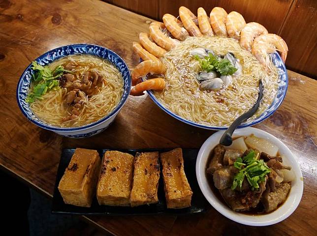遠遠就可以看到的排隊人潮外,大量原木色調裝潢的攤位店面也非常醒目不怕找不到。攤位在市場裡所以內用座位並不多,排隊點完餐店員才會帶位,人多時需要多一點耐性。店名直接叫米粉攤,當然就是要來吃米粉湯囉!料多味美的米粉湯是古早味的粗米粉,「招牌海鮮芋頭米粉湯」裡除了軟綿的芋頭外,還有鮮蝦、中卷、炸魚片、虱目魚丸等海鮮,搭配上香菜、芹菜、蛋酥跟鮮甜的湯頭吃起來超滿足!晚上賣完就關店,記得要早點來!