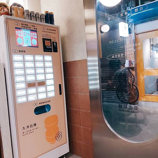 由來自日本名古屋的拉麵師傅創立的「大角拉麵 ダージャオラーメン」,店內白色系基底配上芥末黃跟粉橘色的簡約摩登風格裝潢。結合了霓虹燈招牌跟超道地日本味的點餐機點餐方式,吧檯式座位上的花磚桌面又多了一點台灣本土文青感。拉麵口味上不但有雞湯/豚骨可以選擇,還可依喜好再分鹽味/醬油不同。