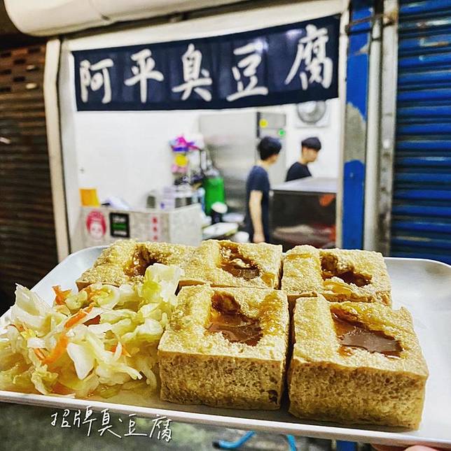 「阿平臭豆腐」在東門市場裡小小的店面,沒有什麼特殊的裝潢只有大大寫著的店名的布簾。老闆兩兄弟花了4~5年時間學習炸豆腐、並走遍台灣尋找理想的臭豆腐口味。現點現炸的臭豆腐外酥內軟,又臭又香實在難以招架,路過就會想要排隊來一份,覺得只有臭豆腐不夠吃還可以點搭配其他炸物的臭豆腐拼盤吃個夠!