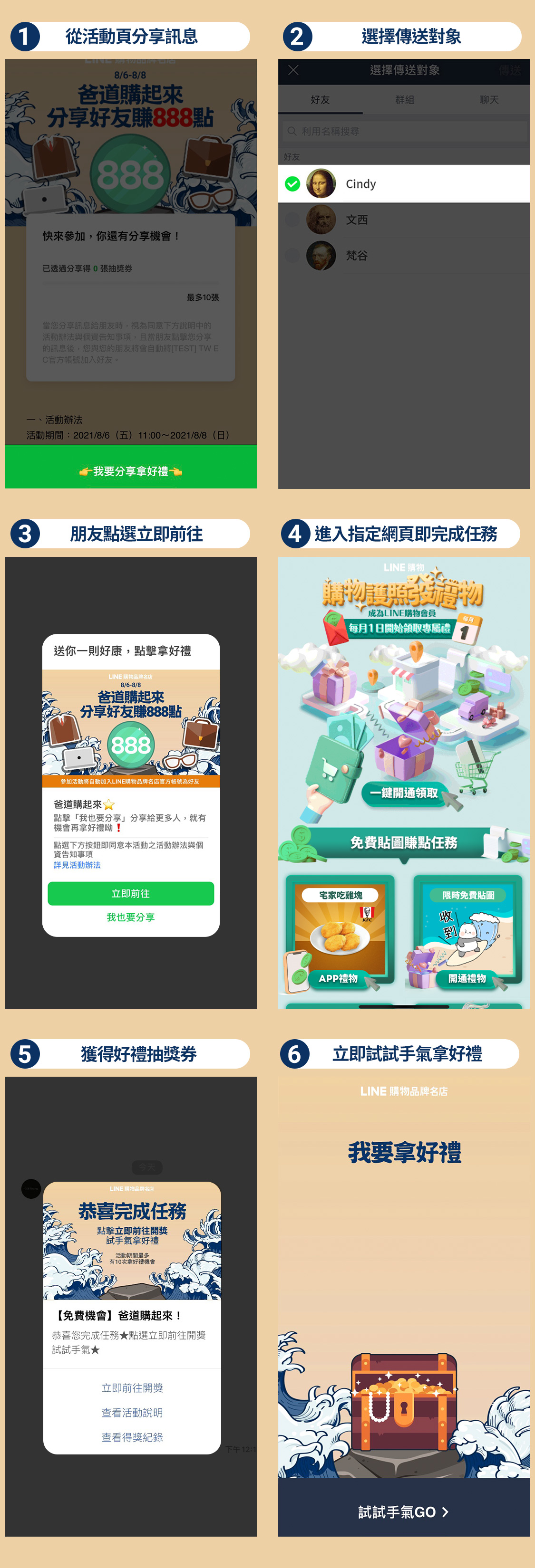 6. 此活動期間為2021/8/6(五)11:00~2021/8/8(日)23:59,請在此活動期間內完成分享,而收到好禮之用戶,亦須於2021/8/8(五)23:59前點擊網址。逾期未完成分享或兌換者,視同放棄並自動取消資格。