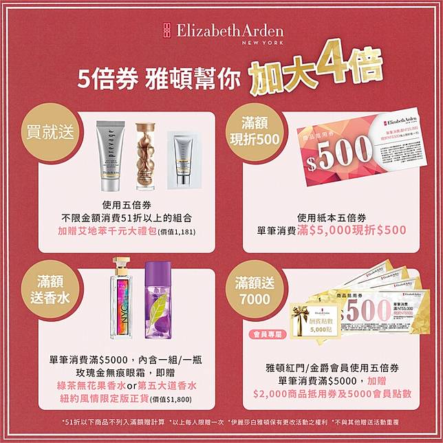 針對雅頓的紅門會員與金爵會員,活動期間內單筆消費滿NT5000,額外加贈價值NT2,000商品抵用券以及5000會員點數,等於會員可獲得價值NT7,000元之加碼好禮。