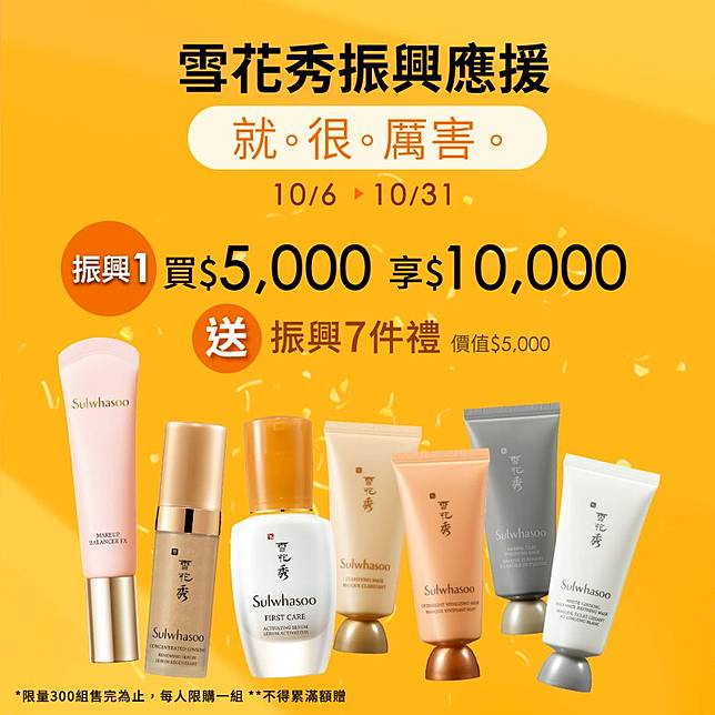 櫃上任意消費滿NT5,000即贈價值NT5,000的振興七件豪禮包(透潤妝前平衡乳正貨一支不挑色價值+玉竹草本亮采面膜35ml+山茶根極潤修護面膜35ml+岑草白泥淨膚面膜35ml+白蔘煥顏磨砂面膜35ml+潤燥養膚精華15ml+滋陰生人蔘緊緻煥顏微導精露5ml。限量 300 組售完為止,每人限購一組。不合併檔期滿額贈)。