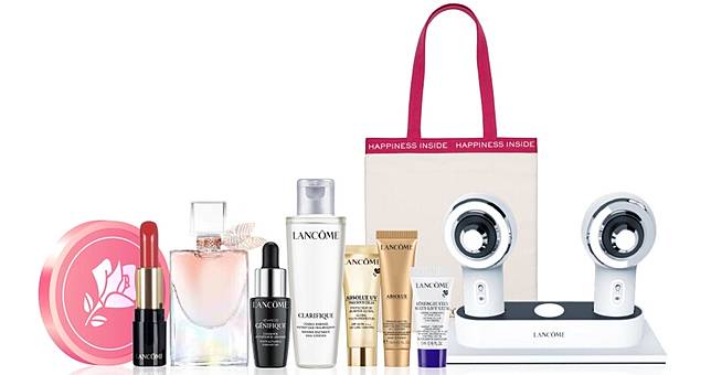 正值百貨週年慶檔期之蘭蔻專櫃,單筆消費滿NT3,000,並持任一振興券結帳,即可獲得「明星五件禮」(超未來肌因賦活露7ml、超極光活粹晶露50ml、幸福托特包、蘭蔻超音波科技護膚、蘭蔻會員點數3000),總價值高達NT6,867元,全台限量2,000份(此活動限週慶正檔期贈送,預購會期間恕不配合。數量有限贈完為止,以上門檻不重複累贈,可與週慶原來滿額贈累贈)。