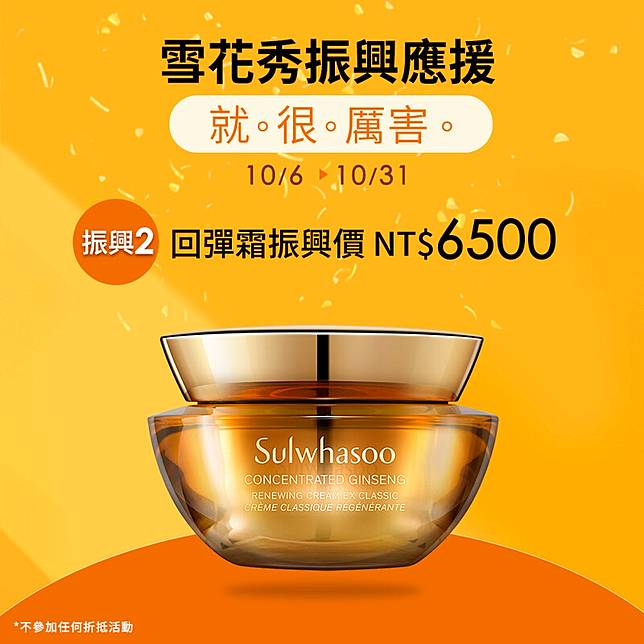 消費單品或組合皆享振興優惠價NT6,500(原價NT7,200,現省NT700),一擦即化開的輕盈舒芙蕾質地,搭配清新淡雅人蔘花香調,即刻感受肌膚緊塑回彈。