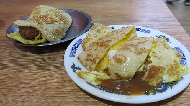 到了秦小姐必點的美食是甚麼呢?首先是鹹豆漿(30~45元),不同於日本口味的豆漿,甜鹹衝擊的美味一定要嚐嚐;蛋餅類別的推薦美食是酸豇豆蛋餅(40元),酸豇豆本身的鹹味配上蛋餅內的蛋,兩者將鹹度調和得剛剛好,可以再加點店內用炸的獅子頭,配上店家特製的辣醬,讓人印象深刻美味又口齒留香。