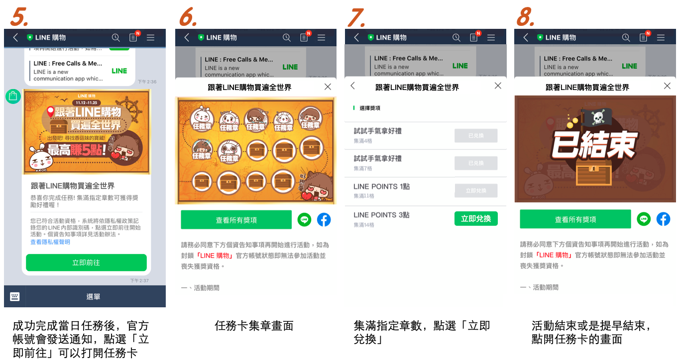 3. 獎勵全數兌換完畢後,活動即會提前結束,無法再集章或領取獎項,隔日將公告於活動辦法及推播於「LINE 購物」官方帳號。