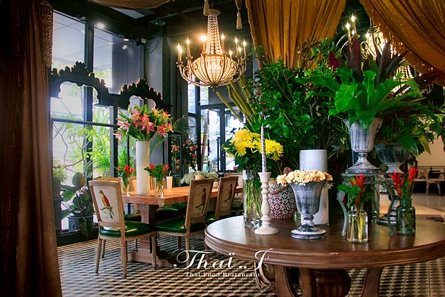 以鹿角蕨、水晶燈、法泰料理美味交織而成的熱帶花園 Thaï.J,白天是陽光浪漫的空中花園,夜晚則是神秘的熱帶雨林。在這裡可以同時品味法式的慢與美、泰北的熱情與火熱。從一入門的法式水晶吊燈、泰式的狂野原創繪畫以及熱帶雨林的自然元素,讓人立即融入Thaï.J獨特的裝飾藝術,不論是閨蜜聚會、情人約會都會是一段令人難忘的絕妙體驗。