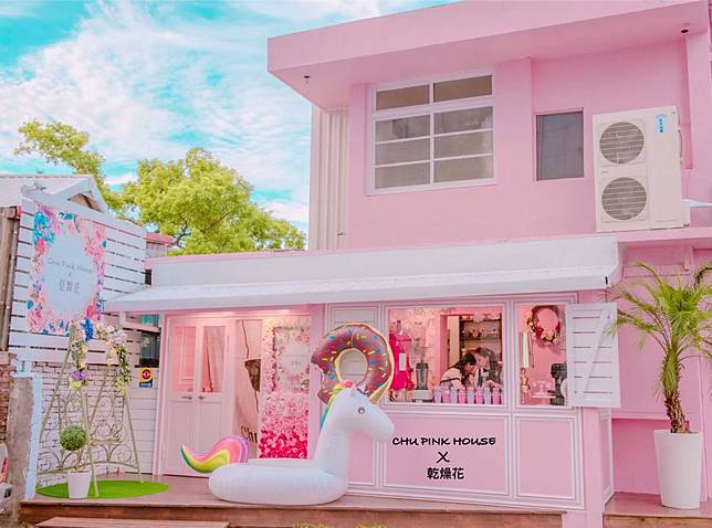 CHU PINK HOUSEx乾燥花位於離花蓮市區不遠的森林路上。門口有著可愛木馬跟桃紅色電話亭,已成為花蓮熱門打卡點。