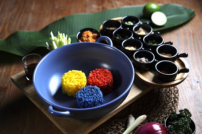 以藍色蝶豆花、紅肉火龍果、微帶辛辣滋味的薑黃,將鮮豔色彩融入精選泰國長米成為三色視覺新組合,再拌入各式泰國辛香料及新鮮蔬果,口感多樣豐富。(圖片提供/Thaï.J)