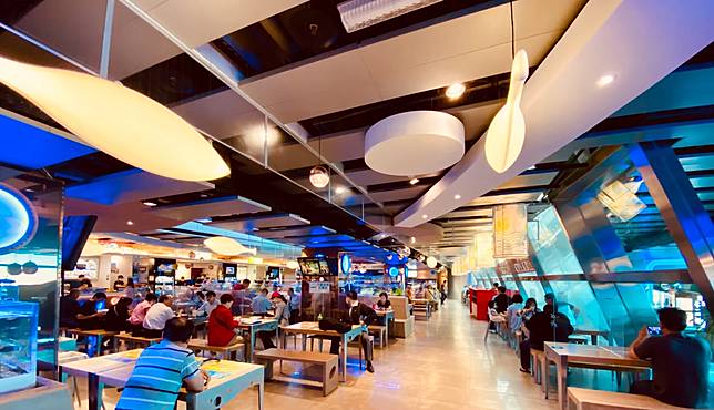 用餐區設計了很多水族箱,,有如在海洋世界中用餐的感覺。(圖片提供/布魯斯老爹)