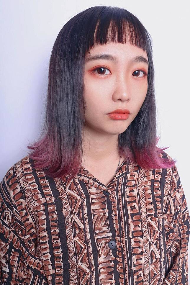 由紫棕的深色髮延伸莓果色調裙襬挑染,搭配眉上瀏海,古靈精怪、復古感大爆發,超推給日系古著女孩!