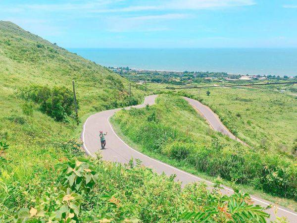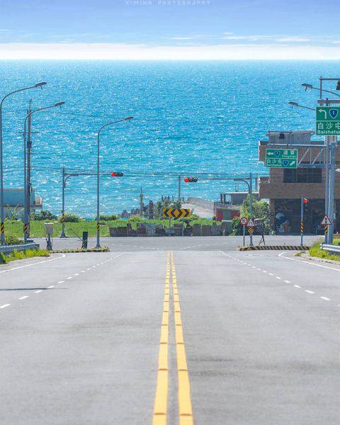 站在筆直的路上朝遠方拍去,湛藍的大海搭配雙黃線的豔黃、指標牌的鮮綠,海岸鄉村的風情更加地被襯托出來,讓這般可愛、簡單、美好的濱海小鎮非通霄莫屬了。