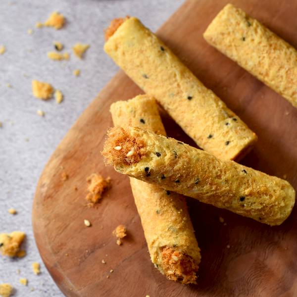 經典不敗的最完美的搭配,鹹香肉鬆搭配微甜蛋捲,有原味、芝麻、海苔、起司共四種口味。