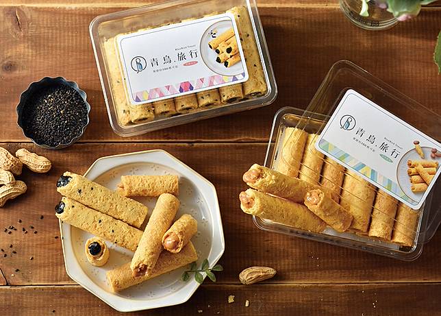 專為吃貨設計的創意蛋捲,青鳥旅行蛋捲兼具傳統酥脆口感,又包覆巧思,每款蛋捲都「有料」!花生口味使用新福源花生醬入內餡,除了每口都能嚐到花生顆粒外,濃郁的花生香氣結合清爽的餅皮,滋味更是鹹甜不膩。芝麻沙沙蛋捲以微濕的芝麻醬結合酥脆的蛋捲,香味溫潤且醇厚,新吃法是先微波50秒,再冷卻2分鐘,可以讓流沙滋味更明顯。