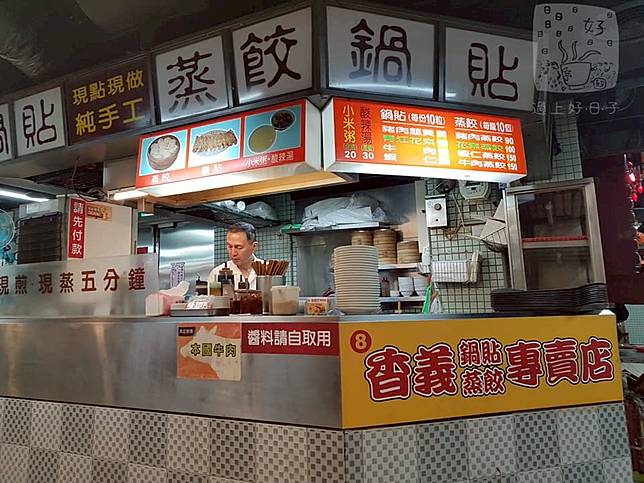 龍山商場美食街內的香義鍋貼蒸餃生意不比前兩家人氣鼎沸的名店,但小小的攤子淨素整潔,不管是鍋貼還是蒸餃,老闆都堅持客人點餐了才包製烹調,口感熱燙、內餡新鮮是它最迷人之處。