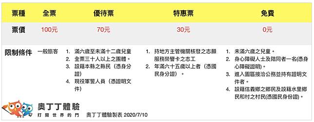 ▲南投集集雙龍七彩吊橋票價表。(奧丁丁體驗製表 2020.7)
