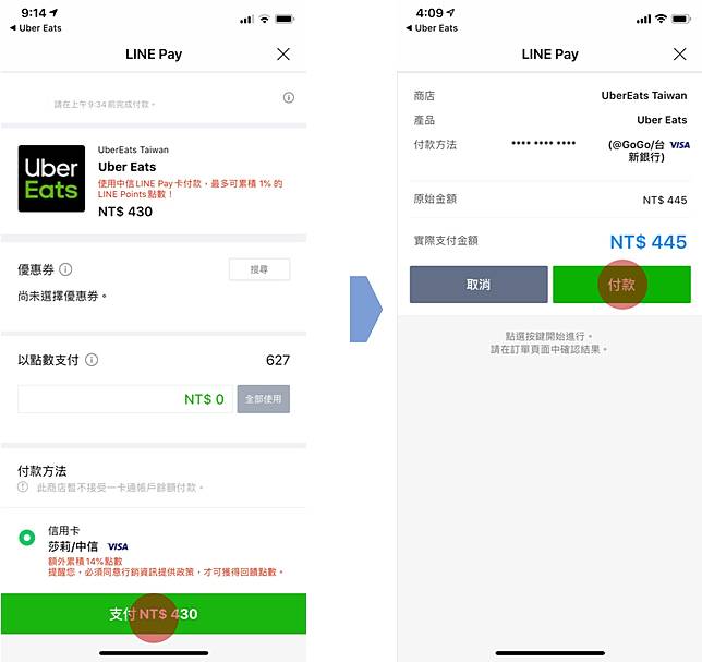 - 目前僅能使用已綁定的信用卡/簽帳金融卡及LINE POINTS點數付款
