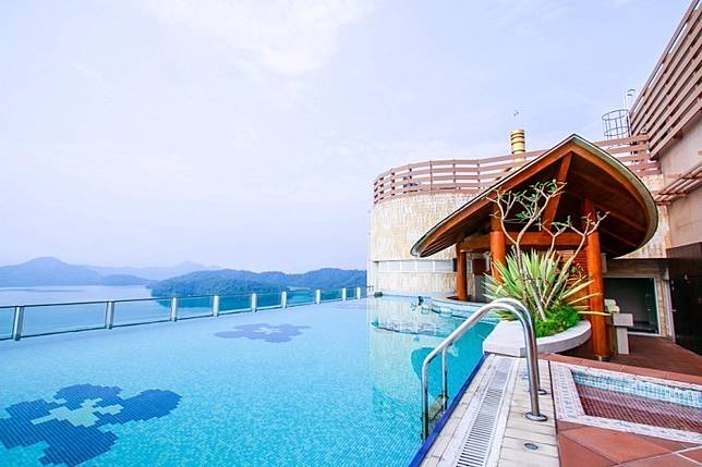 泳池採玻璃造型設計,營造出真正無邊際視覺效果,徜徉在水天一色的景觀中,被群山環抱著,是一種悠然自得。首創水中吧台,也能在池畔享受一點微醺的浪漫。