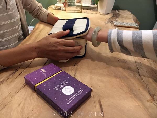 zhen體驗的是氣卦能量療程,以左手放至精油罐上感受並挑一瓶