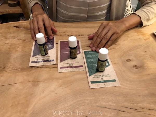第一步先簡單諮商最近的身心靈狀況,然後放鬆的把手放在精油上感受並抓3瓶出來