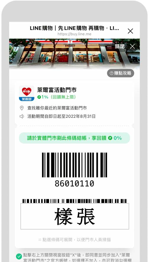 活動期間至萊爾富全台活動門市,萊爾富會員(報手機號碼可立即加入會員)消費出示「LINE購物條碼」掃碼結帳(點我開啟條碼),享LINE POINTS 1% (排除不回饋商品,小數點無條件捨去) 回饋無上限。