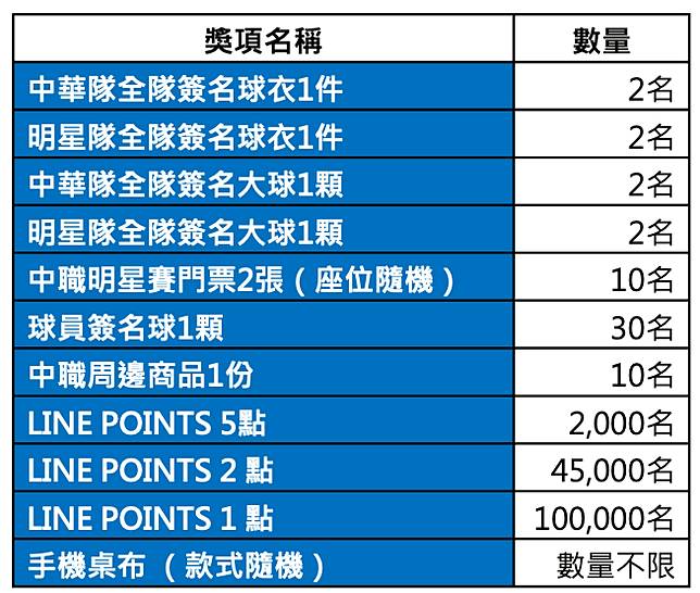 *「中華隊全隊簽名球衣、明星隊全隊簽名球衣、中華隊全隊簽名大球、明星隊全隊簽名大球、中職明星賽門票、球員簽名球、中職周邊商品」另需符合「於規範時間內參與活動並回傳領獎表單」之條件