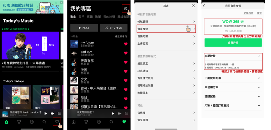 13. 如欲了解目前的使用會員方案,請至LINE MUSIC App中「我的專區」>「設定」>「會員身份」,即可確認目前方案身份、下次扣款日、以及LINE鈴聲/答鈴/背景音樂可使用額度。