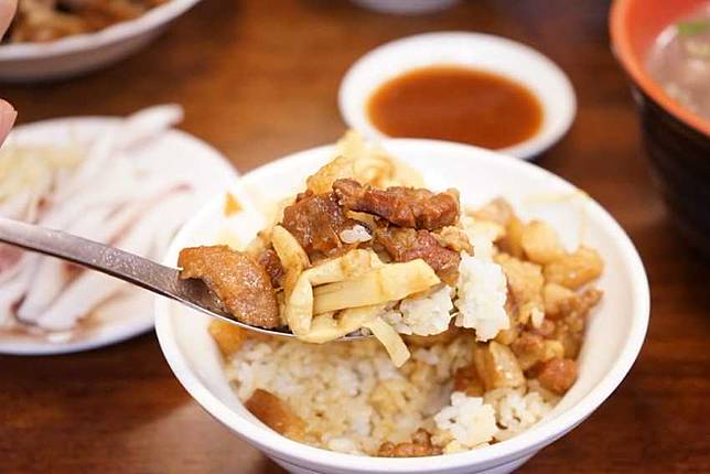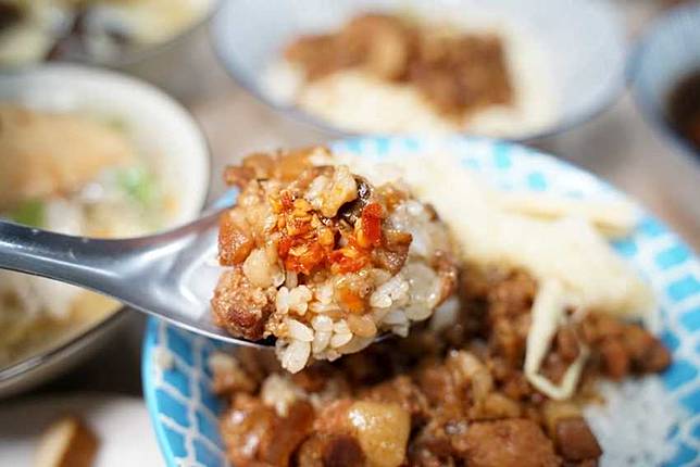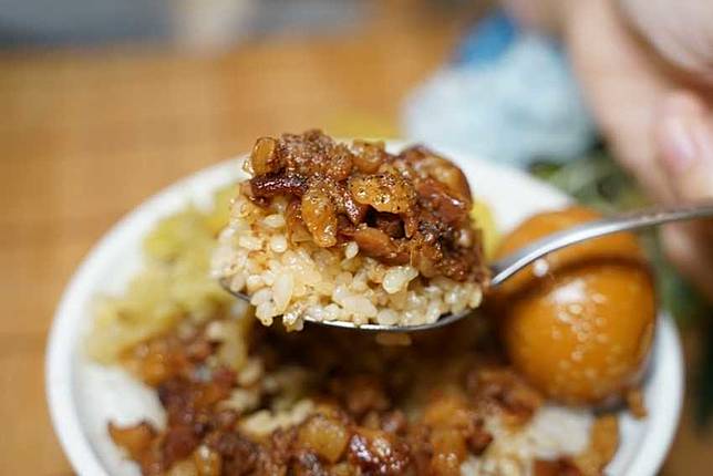 從這一匙滷肉可以看出來,是手工切製才有的大小不同滷肉,堅持手切口感的店家目前已所剩不多,真的可以好好來品嚐看看!滷肉是鹹甜得宜恰恰好的味道,並不會偏甜也不會偏鹹,帶上膠質的口感讓人很喜歡。最重要的靈魂人物就是記得要加上一點特調的胡椒粉,在膠質滿滿又鹹甜得宜的滷肉飯,再加上飄來的胡椒香,真是有開胃又解膩的作用。