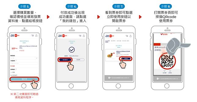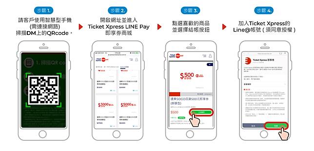 使用步驟:請點擊LINE Pay即享券購買頁(點此前往),或掃描店家提供之購買QR code,進行下列購買流程,以下步驟舉掃描店家QR code為例。