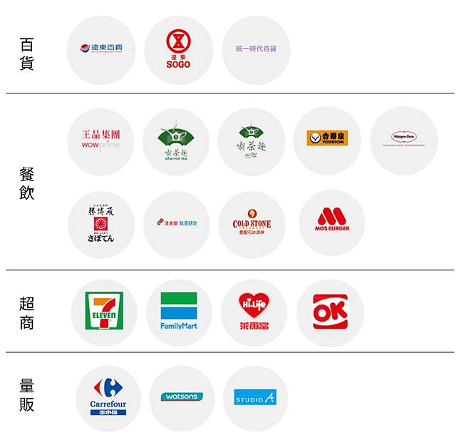 合作通路: 超商量販百貨餐飲 (共4大類別,19個商家,可直接點擊前列類別至各別購買頁面)