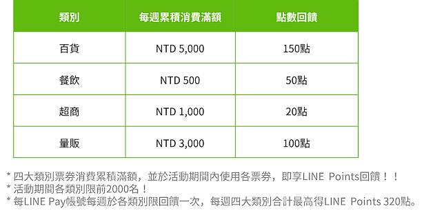 ■ 各類別限前2000名,每LINE Pay帳號每週於各類別限回饋一次,每週四大類別合計最高得LINE Points 320點。