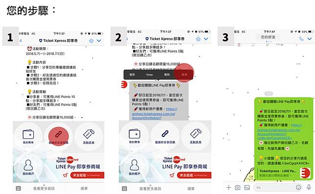 分享步驟:首先請加入Ticket Xpress即享券,下方分別是分享者與受邀者的步驟,任務完成後就可以獲得LINE Points囉!