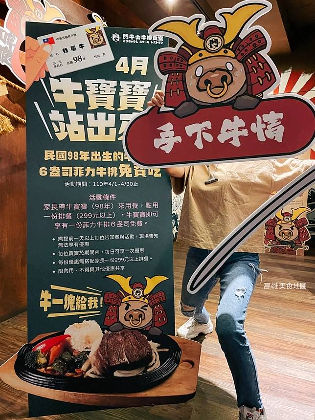 第一彈活動,只要家長帶著〝98年次〞的牛寶寶來店內用餐,點用$299以上排餐,牛寶寶即可享用免費的菲力牛排(6盎司)一客!