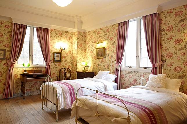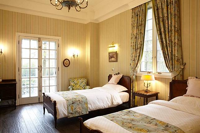 海欣絲雙床房,同樣是以淺色壁紙創造出舒緩的空間氛圍,木製家具搭配暈黃小燈,溫馨舒適使人心暖,英式風格的簡潔舒適打造出最棒的舒眠空間。