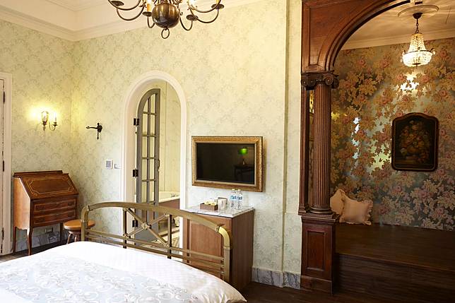 位於一樓的艾莉莎雙人房,是民宿中較為高價的房型。淺色的壁紙讓人身心舒緩。古董歐製床架簡單大方,比一般標準雙人床略小。和洋混合豪華宮廷風,這間類和室架高平台是這間房的特色。