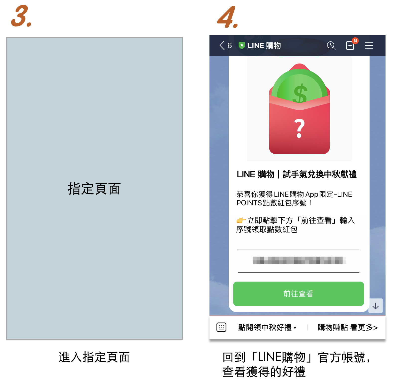通知獲得好禮後,「LINE購物」官方帳號將發送一組序號給您,請點擊訊息下方的「前往查看」即可至我的點數紅包頁,領取點數紅包。
