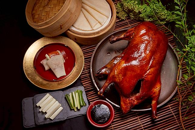 ▲片皮鴨四吃可供10人食用,包含烤鴨捲餅(附10片青蔥餅皮與10片原味餅皮)、鴨腿搭配冰梅醬及上湯鴨骨粥。