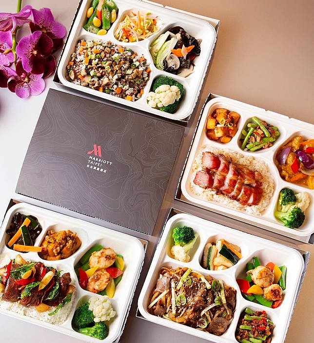 台北萬豪酒店由國宴主廚高鋼輝研發6款盒餐,如著名的黃金片皮鴨、極品蜜汁叉燒、乾炒牛河、三杯豬腳飯、野菇藜麥飯(素)、人氣臘味糯米飯等,大廚除此之外還有各項中西單點菜色供選擇,如最具人氣的台北萬豪牛肉麵(美國牛)、碳烤松阪豬究極肉燥飯,亦有培根起司漢堡、佛卡夏總匯三明治、海鮮墨魚麵、考布沙拉、日式炸豬排咖哩飯等輕量料理,或者愛吃中菜的民眾可以選擇爆炒XO醬牛仔粒、黃金麥片蝦、椒鹽排骨等功夫菜色,每道料理380元至680元不等。