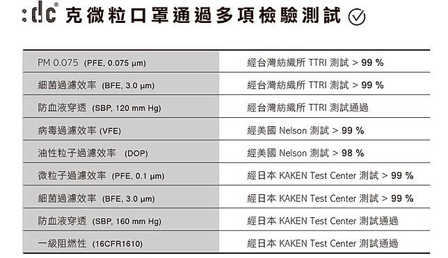 :dc® 克微粒口罩經 95% 酒精清潔 5 次後,台灣紡織所 TTRI 測試,過濾效能仍達 99 %。