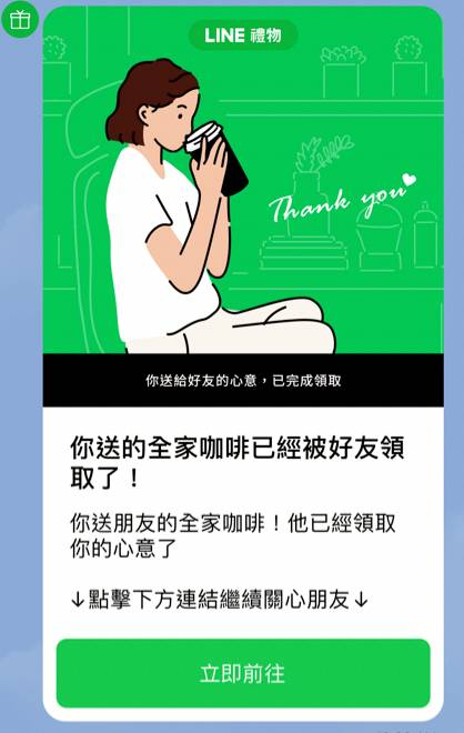 1. 本活動之指定商品,送禮後當朋友完成使用時,收禮者將透過「LINE禮物」官方帳號收到感謝!(如下圖示意)