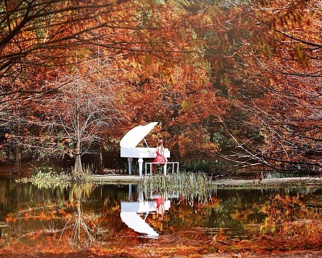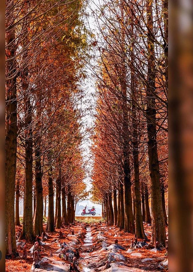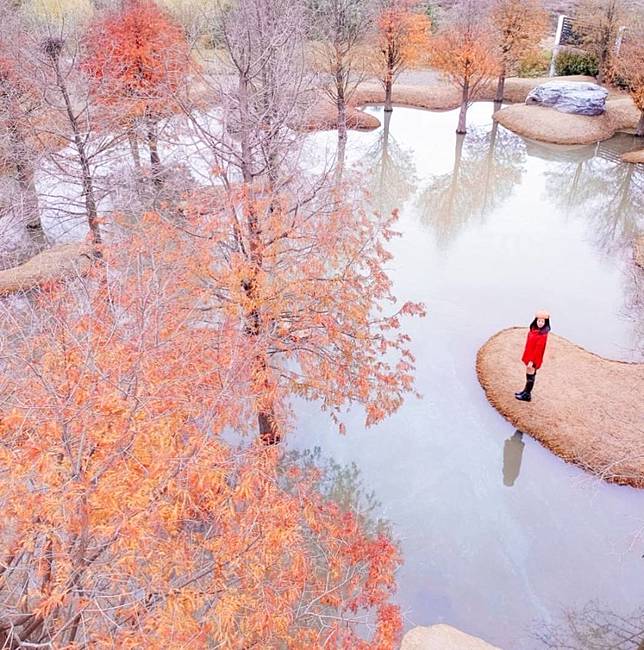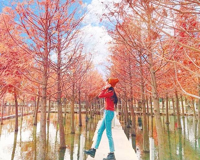 位於台中市西屯區的廣福花海,除了是賞花的好地方,另一頭的落羽松林更是秋冬不可錯過的美景地,沿著水上木棧道,還可以拍出襯著湖面的林木倒影,非常美麗!