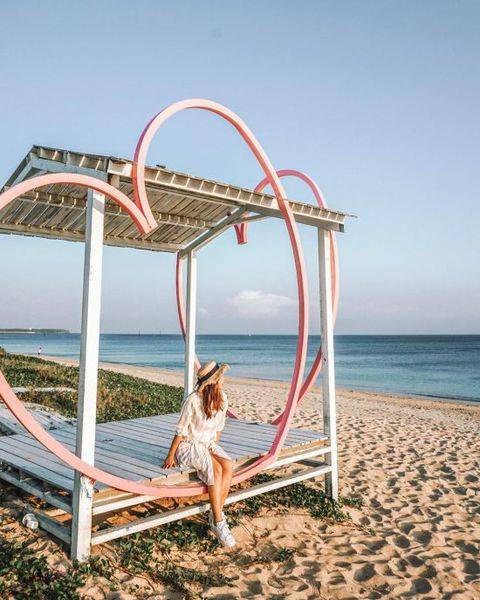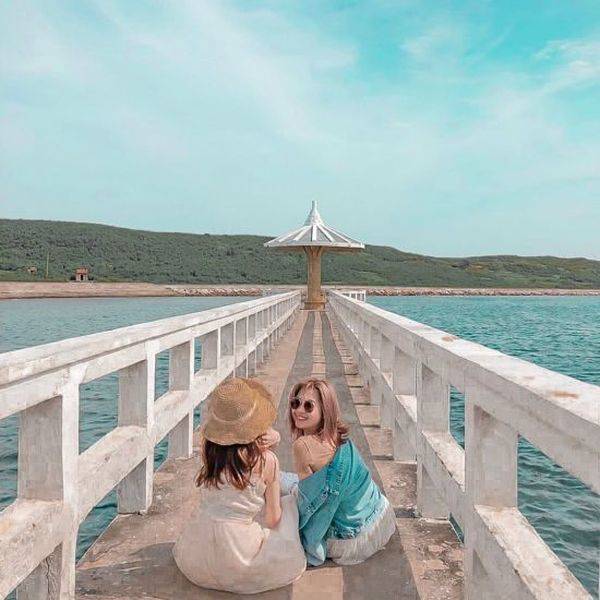 人家說,雙曲橋有兩種樣貌,漲退潮各有差獨特的美。在漲潮時,橋墩被覆蓋後,好像一座漂在水上的涼亭,讓我想到馬爾地夫的水上屋,美不勝收。遠遠的能看見潔白的長廊,將視線一路帶往海中央,兩頭末端各點綴一座藍綠色的涼亭,建議大家可以安排一天在這蔚藍海岸,坐在涼亭欣賞日落美景。