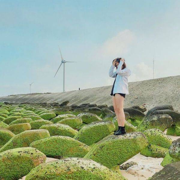 另外在附近的海邊,有著只有當地人才知道的「Q版綠石槽」,和北海岸的老梅石槽很像,一整排坐落在清澈蔚藍海邊的礁石,披上毛茸茸的綠色春日新衣,搭配迎風轉動的白色風車、金色沙灘與廣闊海景,更顯萌感,季節限定錯過再等明年!