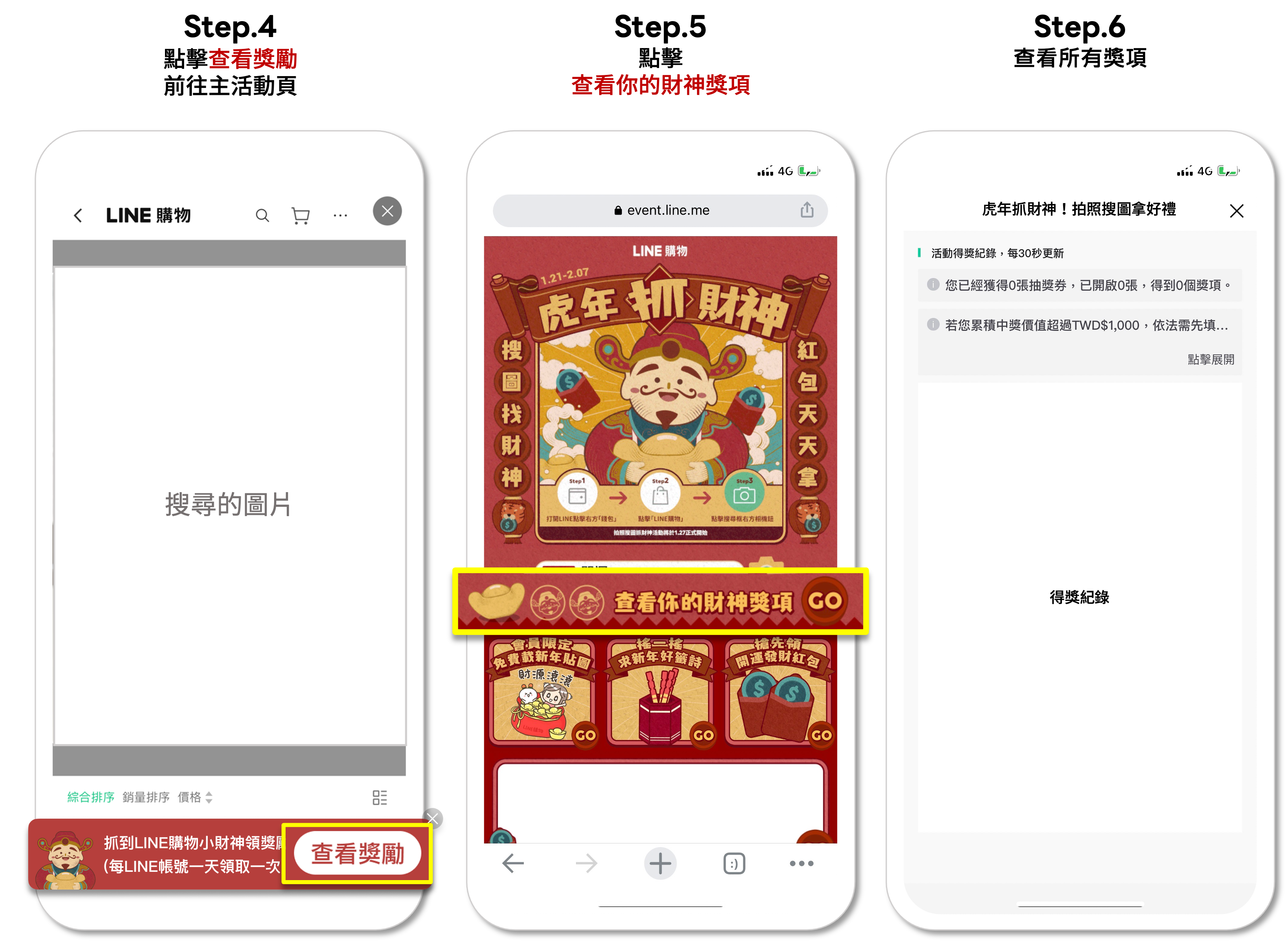 於活動期間,打開「LINE」>「錢包」> 前往「LINE購物」,點擊搜尋框右方相機鈕(拍攝相片或選取照片皆可),完成圖片搜尋行為,到達搜尋結果頁點擊財神通知,即有機會獲得限量好禮。每一LINE帳號一天限領取一次。