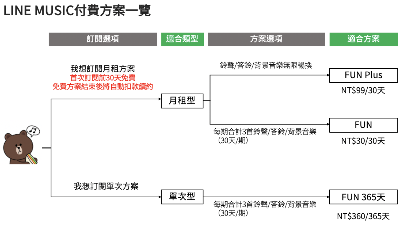 舉例:熊大首次訂閱FUN方案時,即享有前30天免費試用,當熊大改訂閱FUN Plus時,將不會有前30天免費試用的優惠。