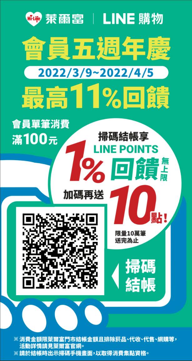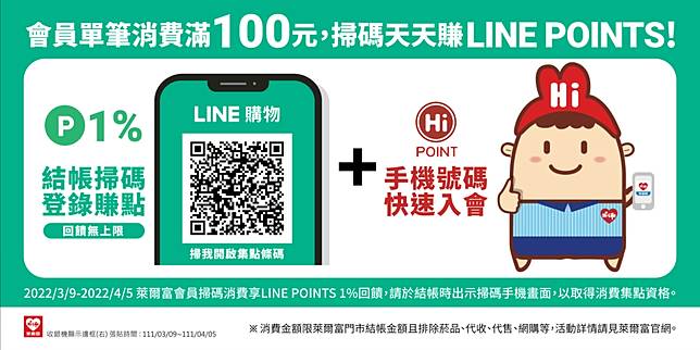 活動期間至萊爾富全台活動門市,萊爾富會員(報手機號碼可立即加入會員)消費出示「LINE購物條碼」掃碼結帳(點我開啟條碼),享LINE POINTS 1% (排除不回饋商品,小數點無條件捨去) 回饋無上限。