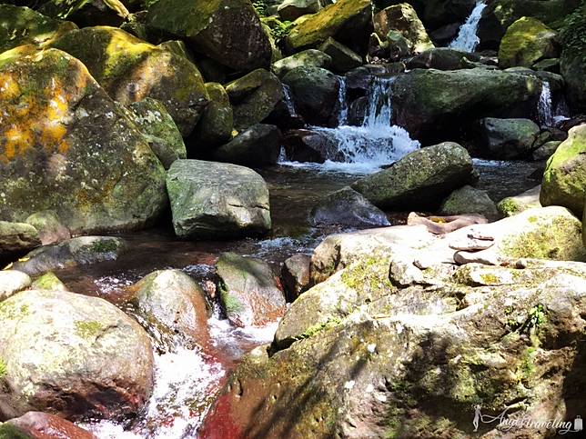 約走20-30分鐘,終於看見第一個指標“青山瀑布步道”經過指標後的風景,宛若在童話故事中的場景,小溪流穿過仿舊鐵橋,巨石上佈滿青苔,感覺隨時有小精靈出沒。