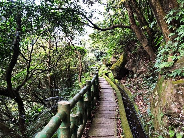 1. 因為青山瀑布步道沿路處於樹蔭下,走在石階地上回萌拍攝,樹蔭的陰影正好可以遮住太陽,有股深入森林的自然感